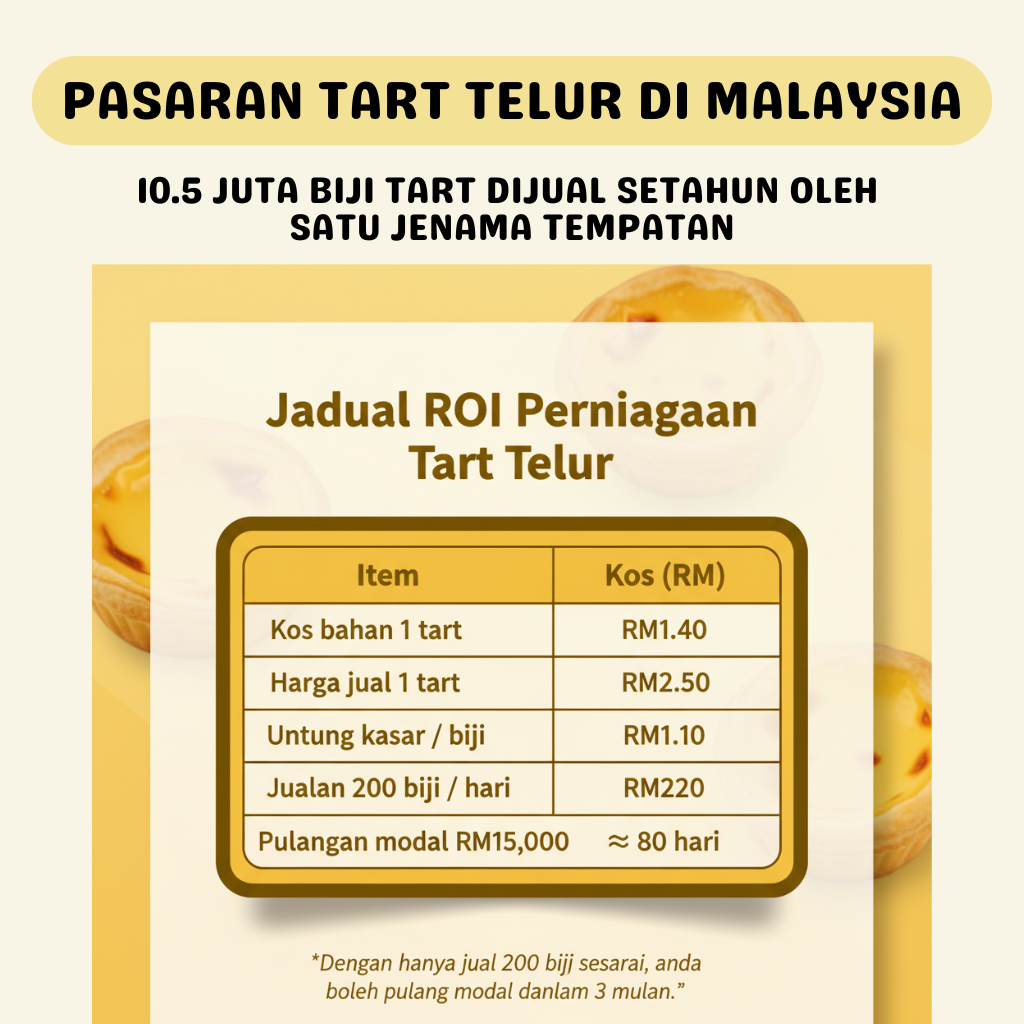 Dengan deposit RM1,000 je, anda boleh mula jual tart telur Halal yang orang memang suka.